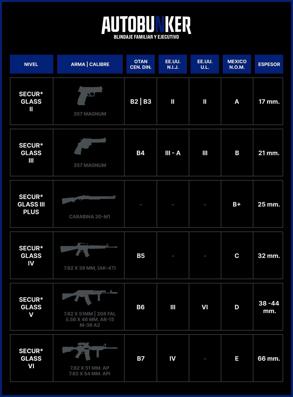Contamos con los niveles 2, 3, 4, 5, 6, 7 y blindaje presidencial, dependiendo del grado de protección que necesite el cliente.